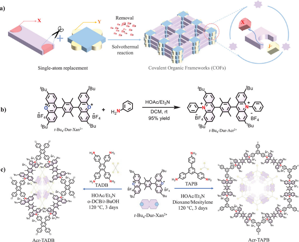 图1 通过单原子骨架编辑合成共轭有机框架材料:a) 用于COF合成的单原子编辑策略示意图;b) 模型反应展示单原子氧-氮置换过程,生成吖啶盐t-Bu4-Dur-Acr2+;c) 以t-Bu4-Dur-Xan2?与TADB或TAPB连接子构建吖啶盐基COFs。